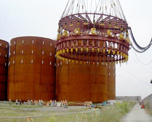 根入れ式鋼板セル工法とは、あらかじめ一体化されたセルを海底の地盤中に直接打ち込んでいく工法です。数台のバイブロハンマを同調運転させ、強力な振動エネルギーを均等にセルに伝える連動システムの開発により、困難だとされていた一体セルの打込を可能にしました。従来の鋼板セル工法が抱えていた数々の問題点を一挙に解決した工法です。